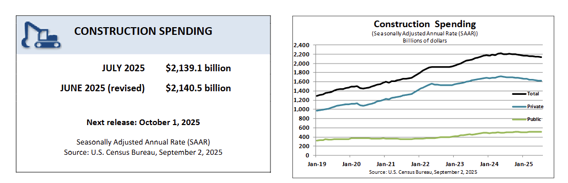 - Private residential construction spending growth included an increase of 0.2% MoM in new multifamily building and a -0.4% drop in new single-family building.