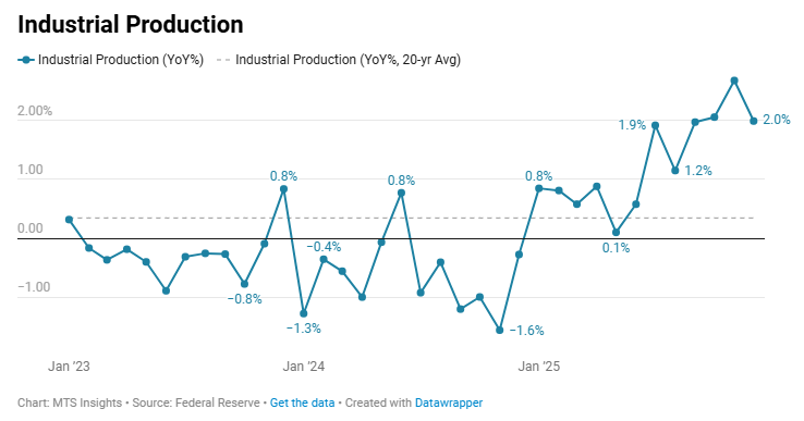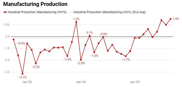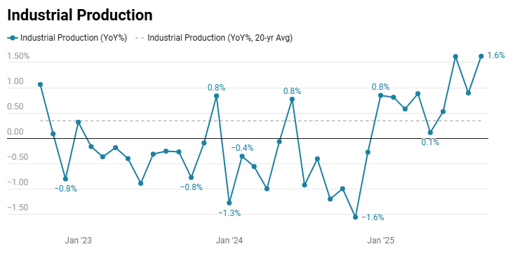 Consumer goods output rose +0.7% MoM and business equipment +0.9% MoM, with gains across all equipment categories, pointing to widespread improvement across demand segments.