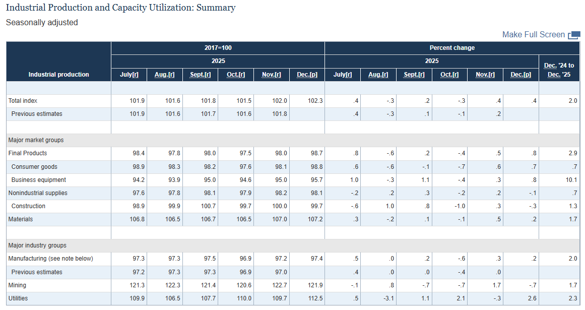 Mining output fell -0.2% MoM after -0.9% MoM in December, while utilities rose +2.1% MoM, showing strength concentrated outside the extraction sector.
