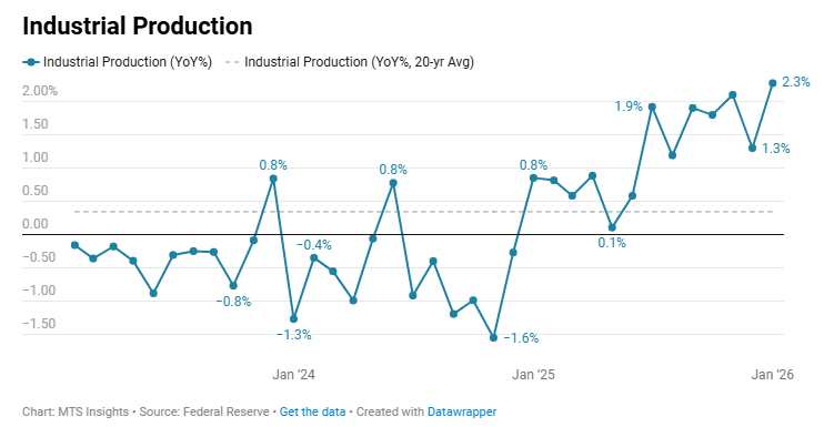Industrial production rose +0.7% MoM (vs +0.4% MoM expected) and +2.3% YoY in January after +0.2% MoM (revised down from +0.4% MoM) in December, showing stronger start-of-year output growth.