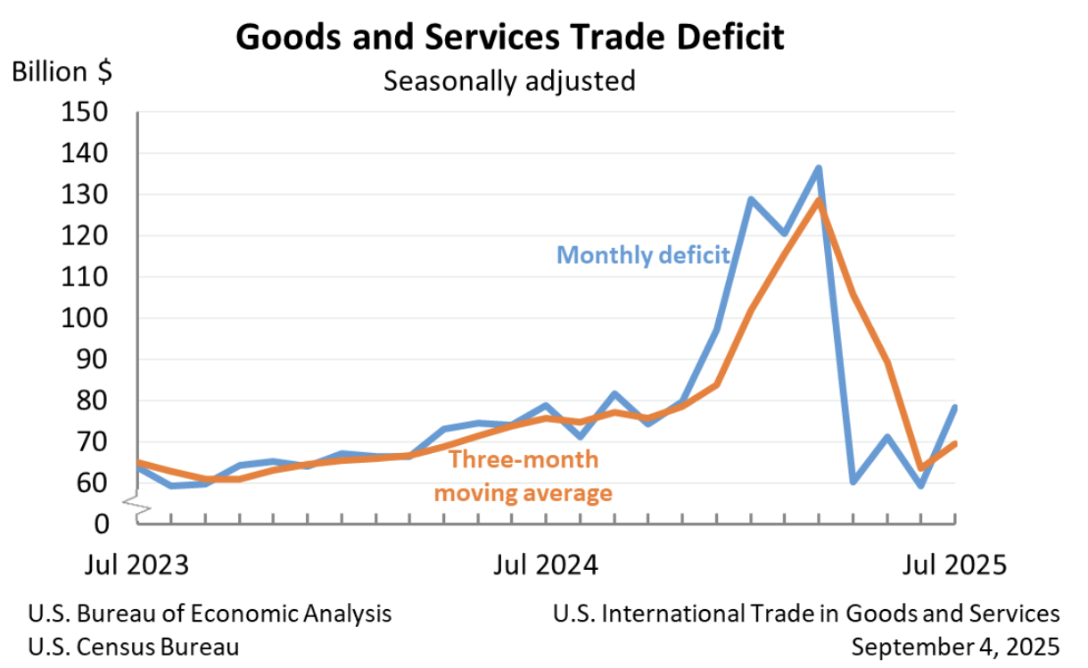 Based on the totality of the report, it appears that the surprise in trade data likely came from an unexpected front-loading of imports from the EU, and in general, an increase in several of the deficits with EU economies. This suggests that firms are highly uncertain about the outcome of an EU-US trade deal, especially one that involves very low or no tariffs. The front-running is similar to what we saw in response to the China and North America tariffs, even though those trade restrictions were harsher.