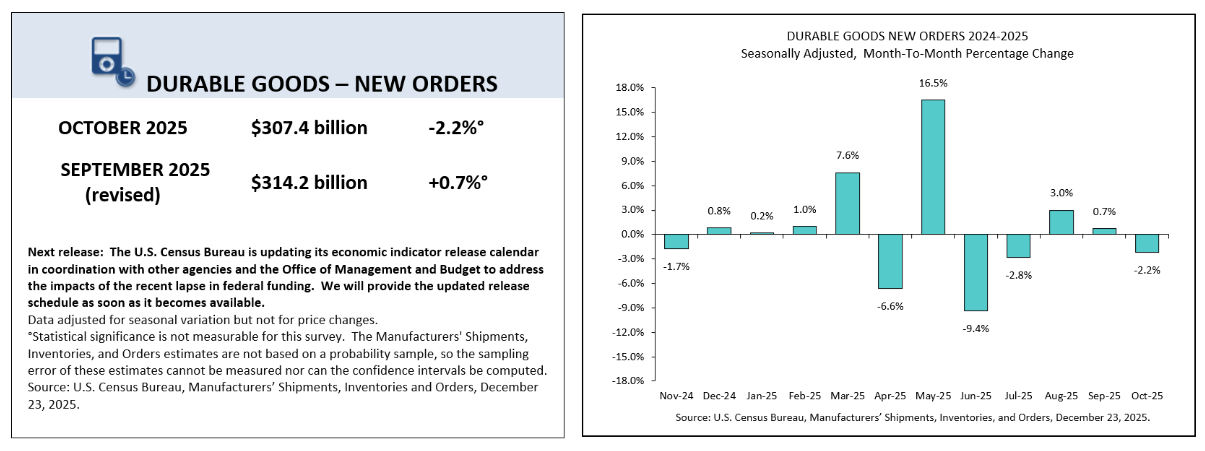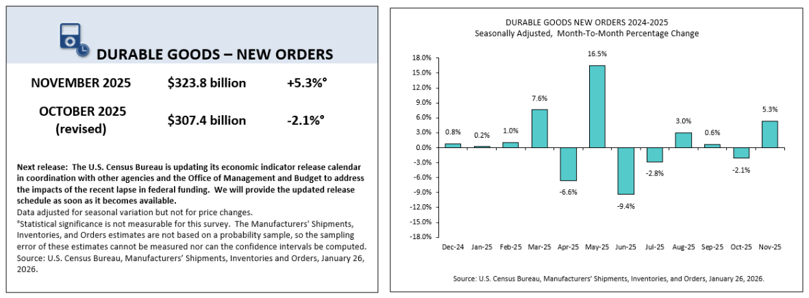 Durable goods new orders jumped 5.3% MoM (vs 3.7% MoM expected) in November, the largest monthly gain since May 2025.