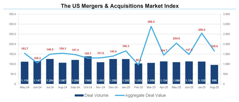 U.S. M&A deal activity decreased in August, going down 15% with 956 announcements compared to 1,125 in July. Aggregate M&A spending decreased as well. In August, 35.1% less was spent on deals compared to July.