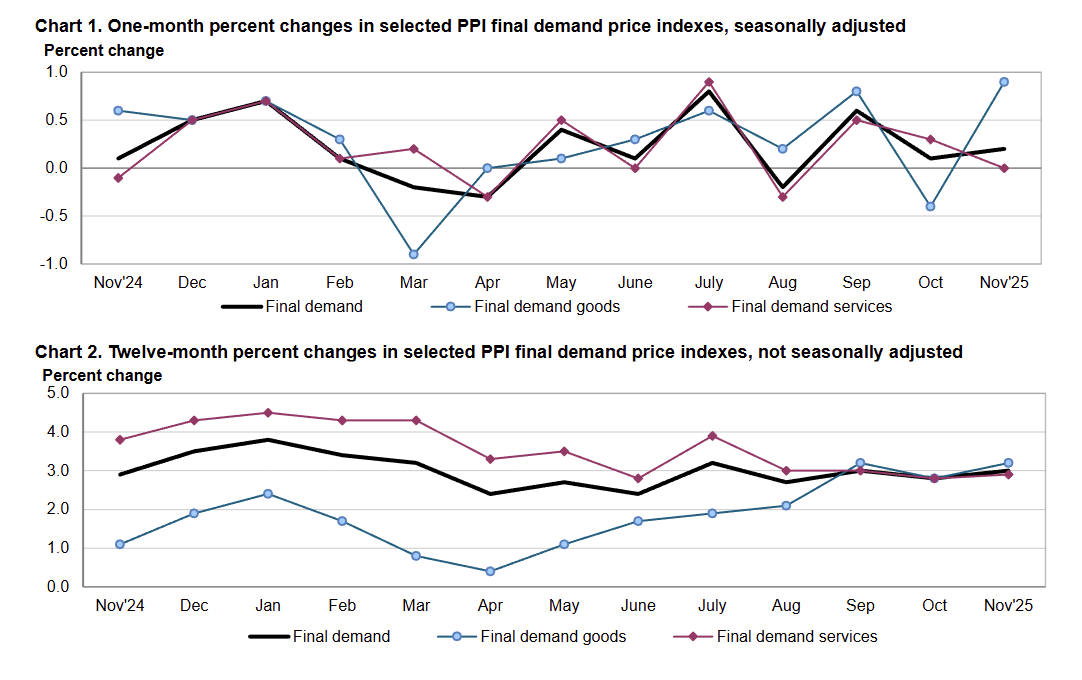 US final demand PPI increased 0.2% MoM (vs 0.2% MoM expected) and 3.0% YoY (vs 2.7% YoY expected) in November, up from 2.8% YoY in October.