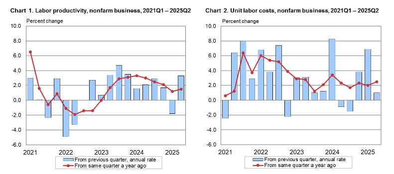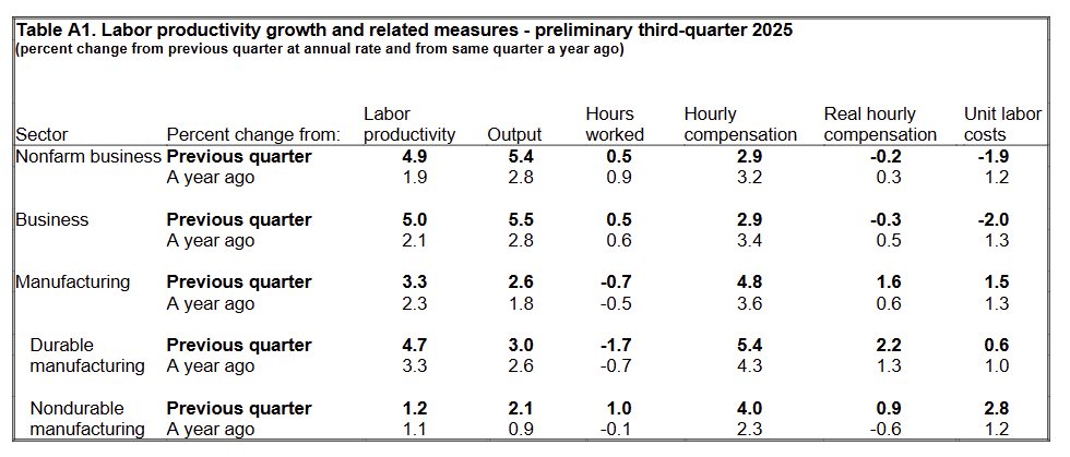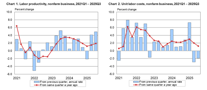 Nonfarm business labor productivity rose +4.9% QoQ and +1.9% YoY in Q3 2025, reflecting strong output growth vs modest gains in hours worked.