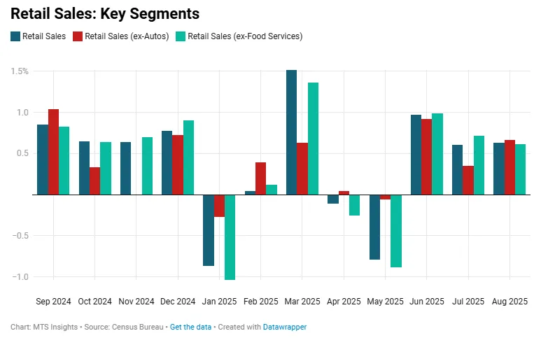 The August retail sales number was heavily affected by the large auto segment as well. Retail sales of motor vehicles & parts were up 0.5% MoM, slightly behind the headline pace as the auto market cooled down from volatility seen earlier this year, caused by tariffs. Affordability is also a concern and has put a bit of a dampener on auto spending over the summer. The segment’s sales over the last three months were down by -0.4% MoM compared to the March-May period. However, on an annual basis, auto sales are up 5.6% YoY.