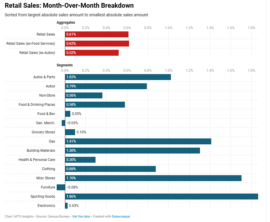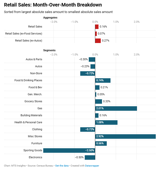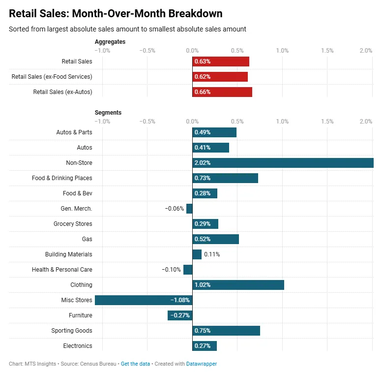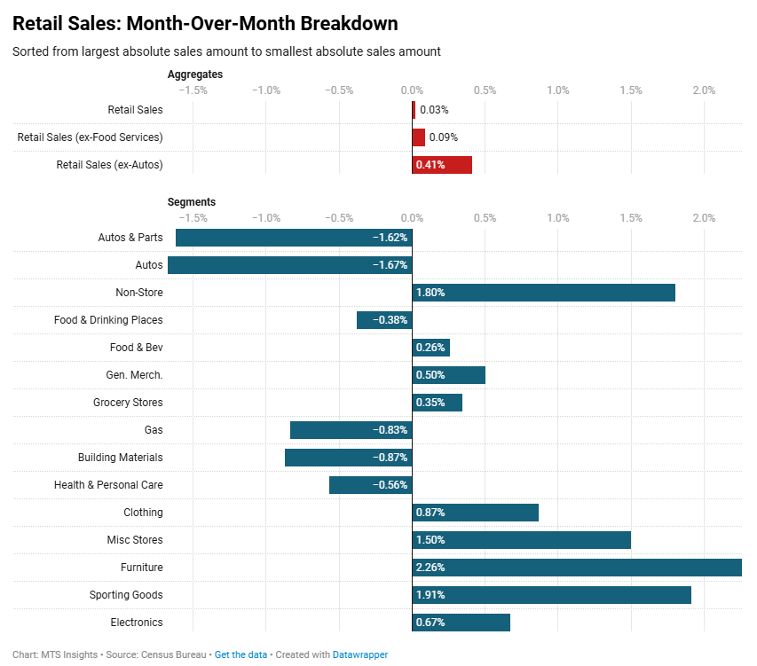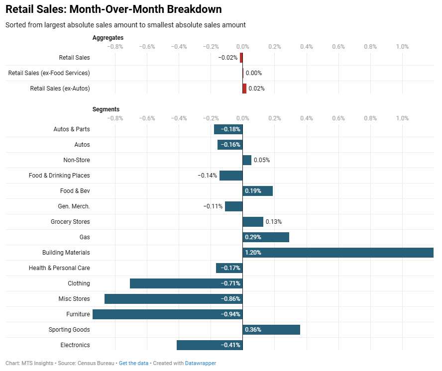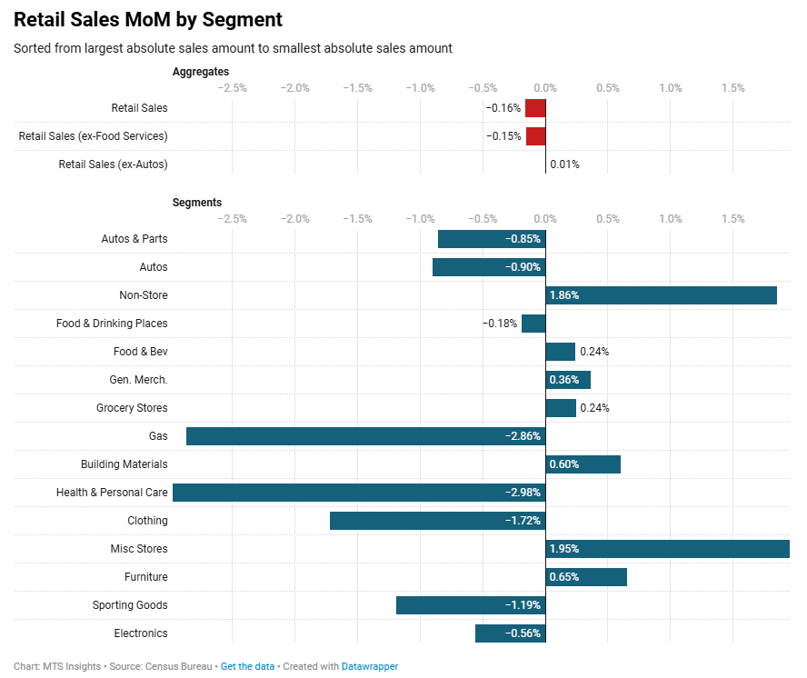 - Many of the smaller segments saw significant declines: clothing (-0.7% MoM), miscellaneous stores (-0.9% MoM), furniture (-0.9% MoM), and electronics (-0.4% MoM).