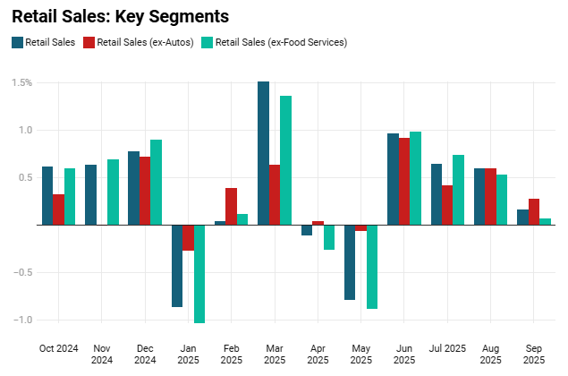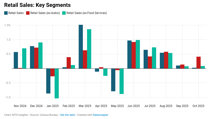 U.S. retail and food services sales were flat (vs +0.1% MoM expected) and up 3.5% YoY in October 2025, reflecting stalled headline growth as auto-related weakness offset gains elsewhere.