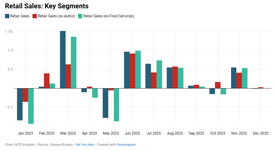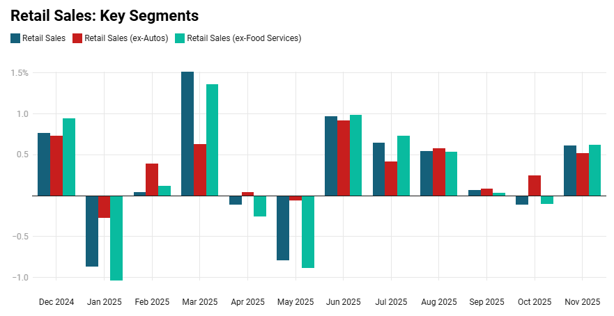 - General merchandise stores rose +0.5% MoM (+2.0% YoY), led by a +4.9% MoM jump at department stores, while nonstore retailers increased +1.8% MoM (+9.0% YoY), remaining the strongest YoY category.