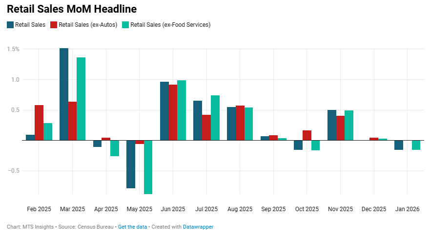 Total retail and food services sales declined -0.2% MoM to $733.5B but increased +3.2% YoY, while sales for the November 2025 to January 2026 period were +2.9% higher than the same three-month period a year earlier.