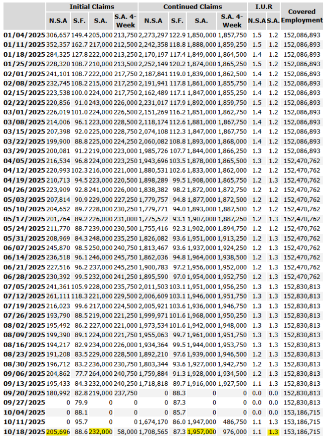 Insured unemployment (NSA) rose more sharply to 1.796 million, up +86,794 WoW, and slightly above the 1.722 million level from a year ago, pointing to a bit more benefit usage as seasonal patterns shift.