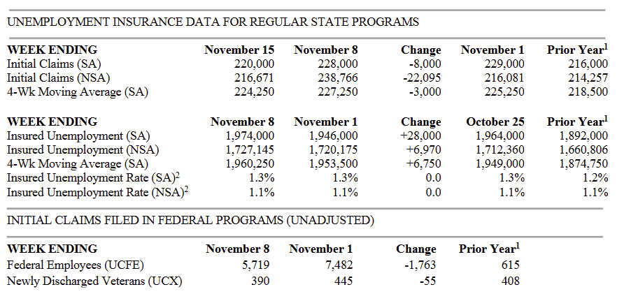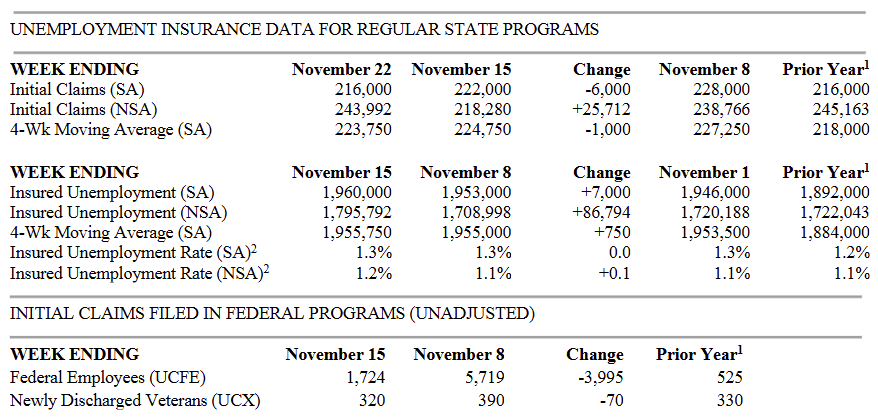 Initial jobless claims fell to 216k in the week ending November 22 (SA), down -6k WoW and matching the level seen one year earlier, reflecting broadly steady layoff activity despite recent week-to-week fluctuations.