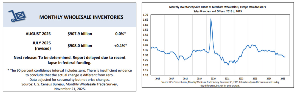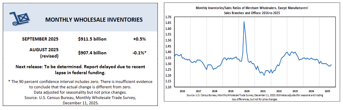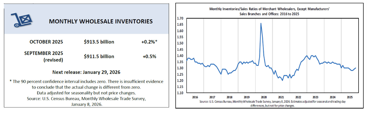 - The inventories-to-sales ratio edged up to 1.30 in October, compared with 1.33 a year earlier, suggesting inventories remain leaner relative to sales than in October 2024.
