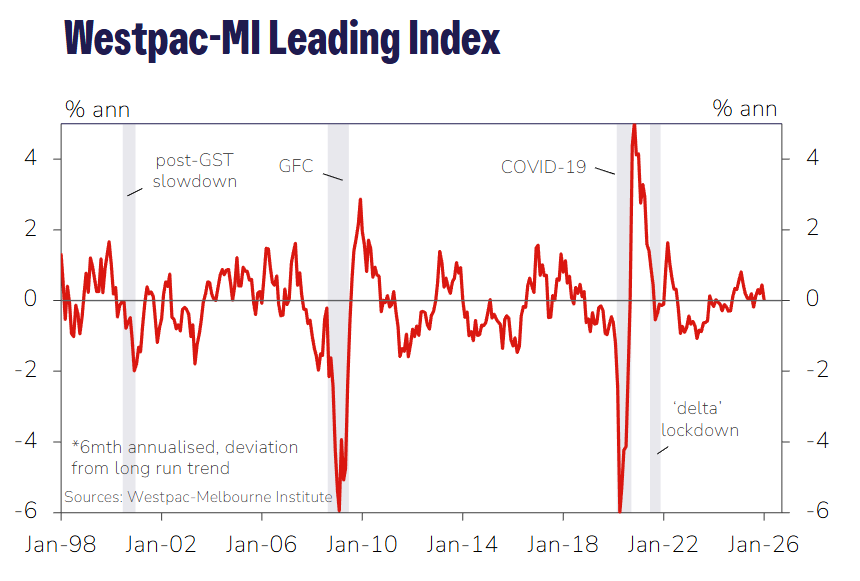 The six-month annualised growth rate in the Westpac–Melbourne Institute Leading Index slowed to +0.02% in January from +0.44% in December, signaling growth momentum stalling into 2026.