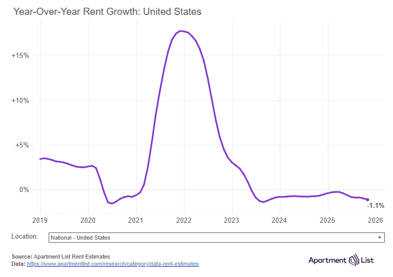- Rent prices nationally are down 1.3% compared to one year ago. Year-over-year rent growth has been slightly negative for more than two full years, and the national median rent has now fallen from its 2022 peak by a total of 5.9%.