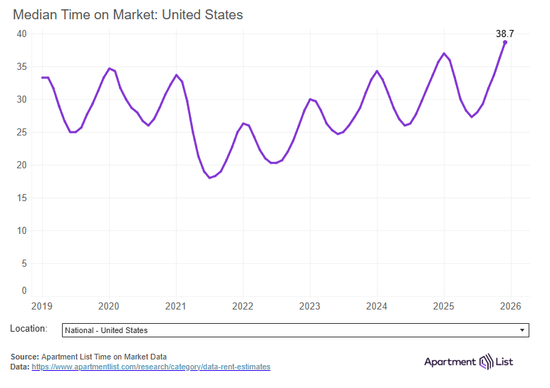 As more vacant units have come onto the market, those units have also been sitting vacant for somewhat longer. Our “time on market” index tells us how long it takes for units to get leased after they are first listed on our platform. This “list-to-lease” time is a highly-seasonal measure, and reached a new peak of 38.7 days in December 2025, eclipsing the previous high set one year ago.