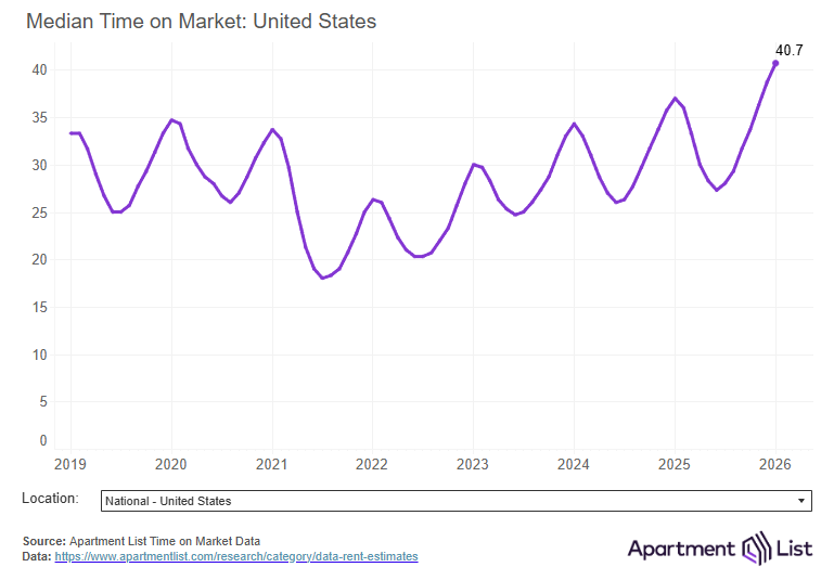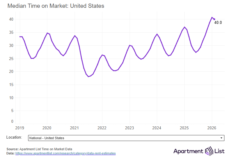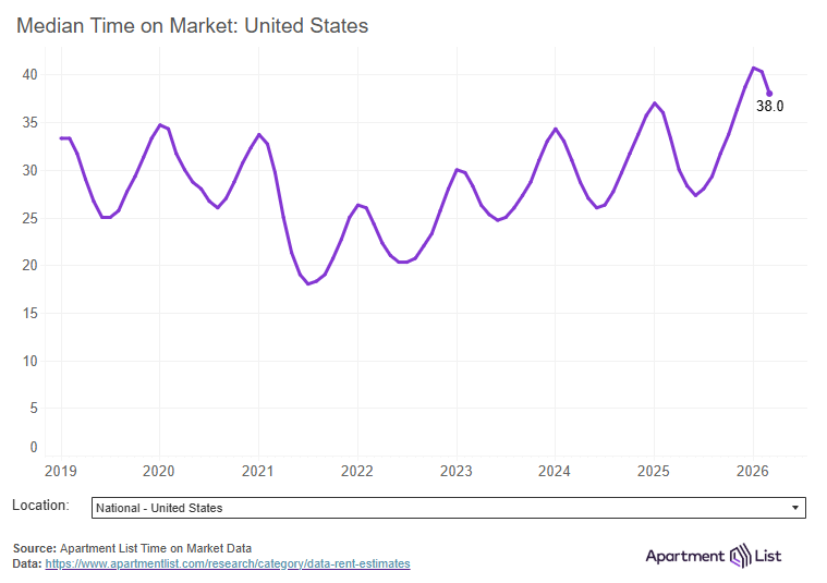 As a result of all this new inventory, more vacant units are sitting on the market, meaning that property owners face more competition for renters and have less pricing leverage. Our national vacancy index – which measures the average vacancy rate of stabilized properties in our marketplace – currently stands at 7.3 percent. This represents the highest level since at least 2017, which is when we started tracking occupancy. Eventually, the market will absorb the swell of new units, and occupancy and pricing trends should begin to gradually tighten. But for now, conditions remain soft, and if anything, the runway for these sluggish conditions is likely only lengthening. The latest data from the Bureau of Labor Statistics showed U.S. employers cutting jobs, and the war in Iran is pushing prices higher just as inflation was getting back under control. These factors have put many households in a state of heightened financial uncertainty, which consequently puts a damper on housing demand.List-to-Lease time remains elevated at 38 days