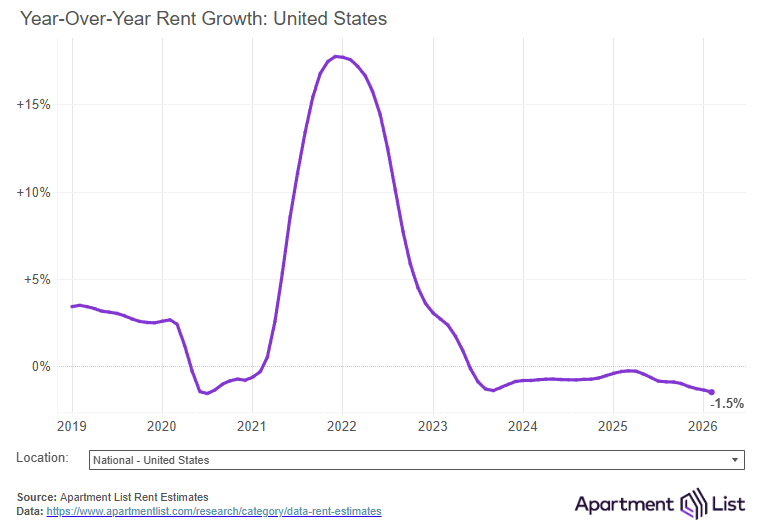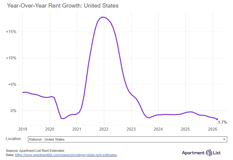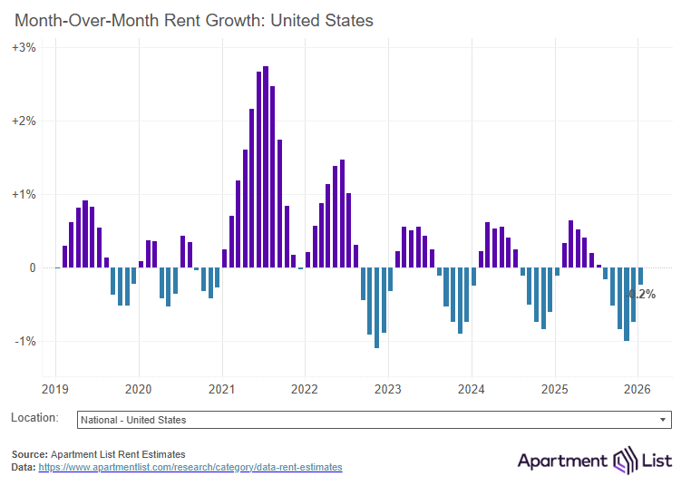 Rents up 0.4% month-over-month, down 1.7% year-over-year