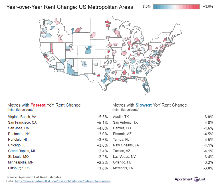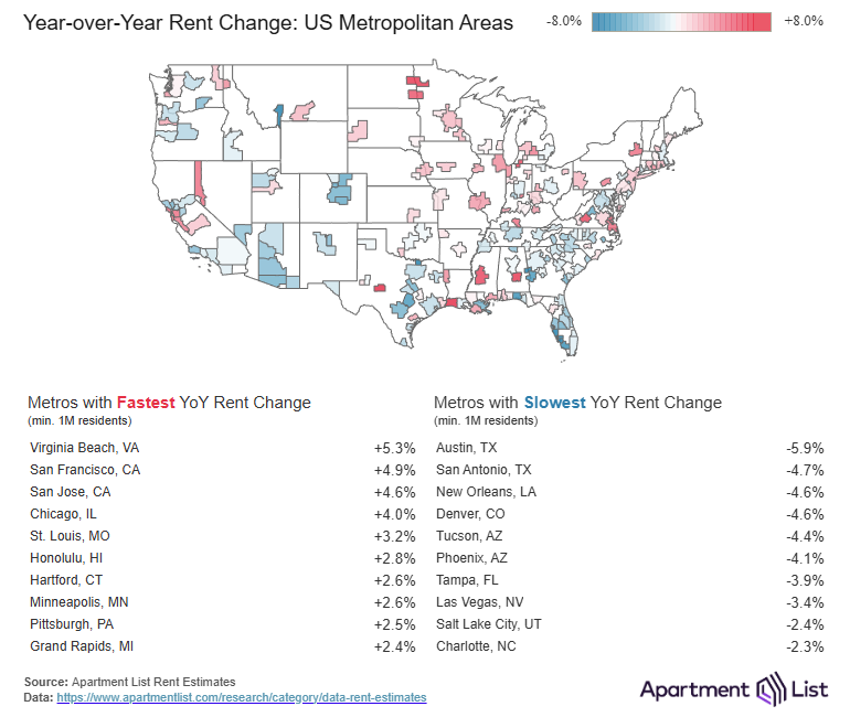 - The Austin, TX metro continues to have the softest conditions among the nation’s large rental markets, with the median rent there down by 6% over the past year. At the other end of the spectrum, the Virginia Beach, VA metro now sits atop our rankings of fastest year-over-year rent growth at +5.5%.