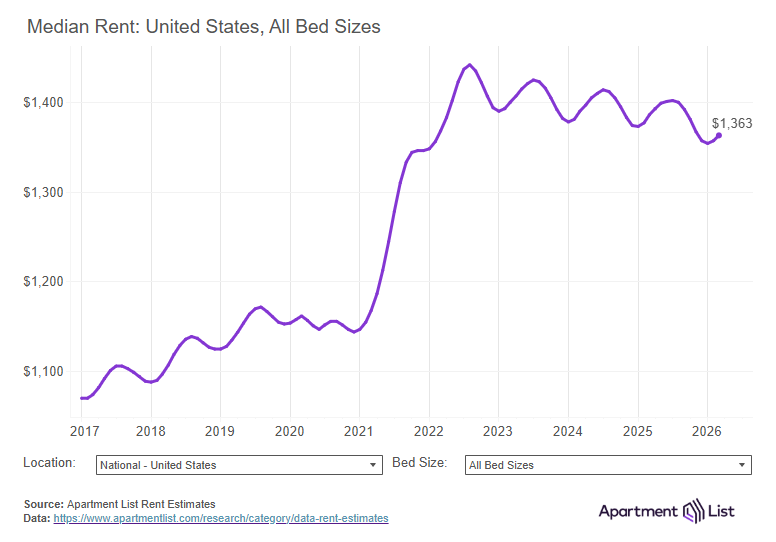 In dollar terms, the national median monthly rent now stands at $1,363, down $23 compared to March 2025. Prices peaked in mid-2022 after a year and a half of skyrocketing growth. Since then, the nationwide median rent has been gradually drifting down and has fallen from that peak by a total of 5.5 percent, or $79 per month. Despite the pullback in prices, today’s rent levels remain 19 percent higher than they were at the start of 2021.