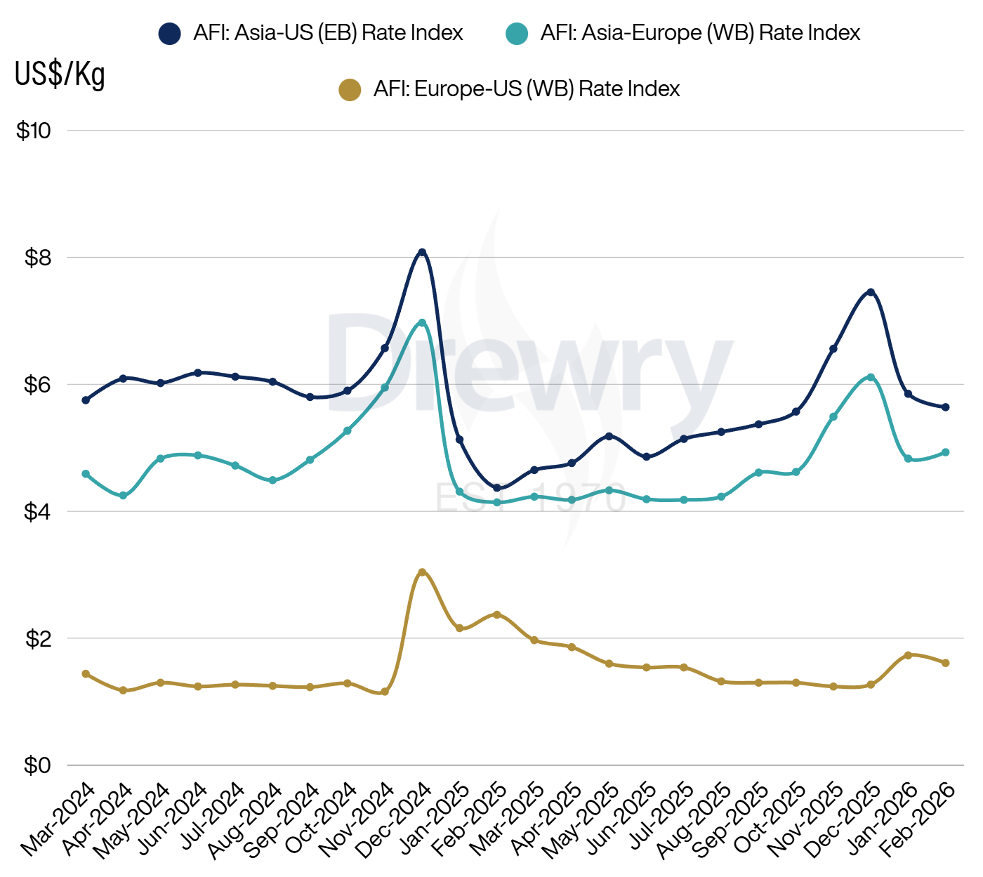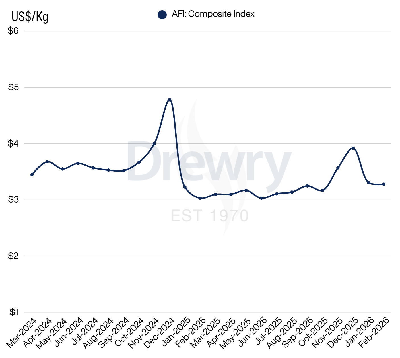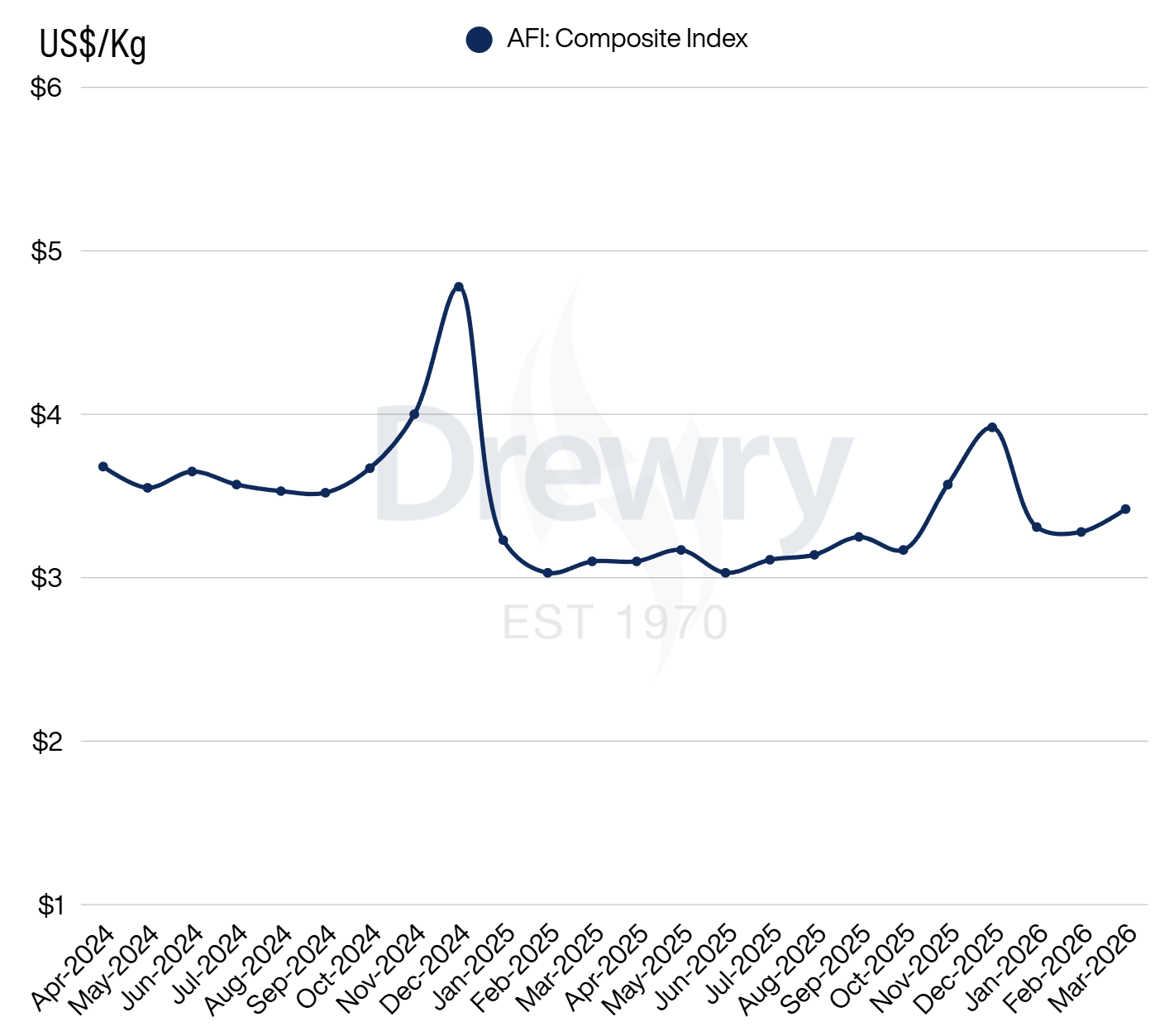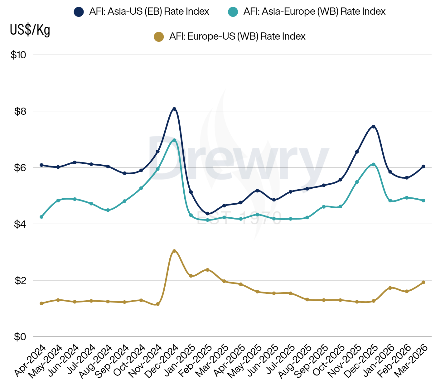 The Drewry Airfreight Price Index for the month is up 4% from February, 10% higher than a year ago. The war triggered a surge in airfreight rates from the afflicted region, with pricing from Dubai to Europe jumping 56-65% from February, while rates from Abu Dhabi to Europe climbed more than 42%. Airfreight rates from South and Southeast Asia also show an immediate impact, as an estimated 30% of Asia-Europe air cargo is routed via Middle Eastern hubs. Rates from India to Europe rose 22-34%. Further pricing pressure could come from mode shifts of strategic commodities like fertilizer stranded by the closure of the Strait of Hormuz.