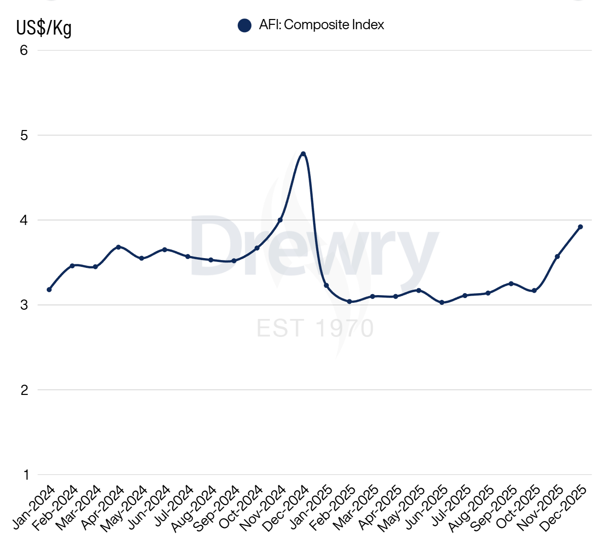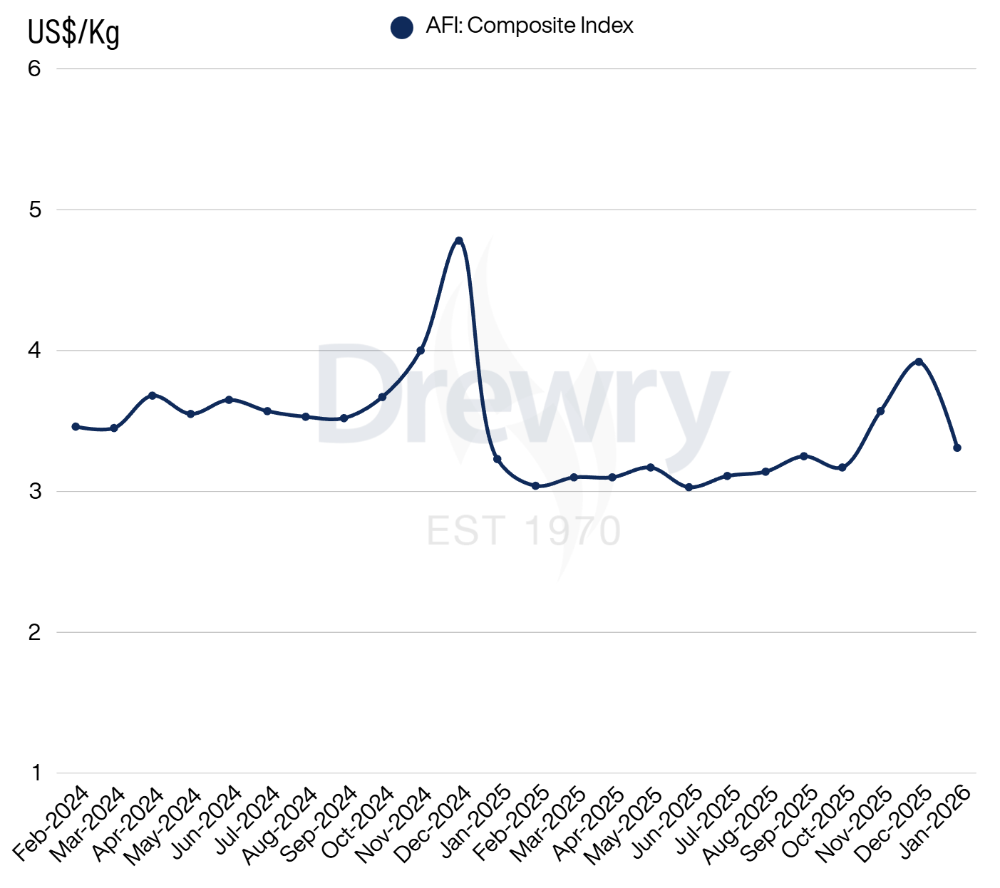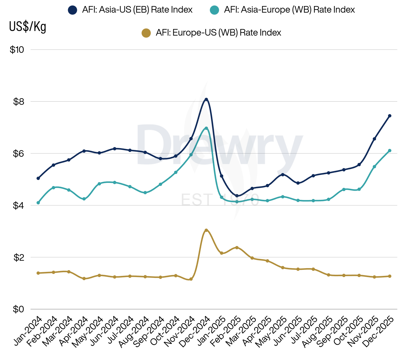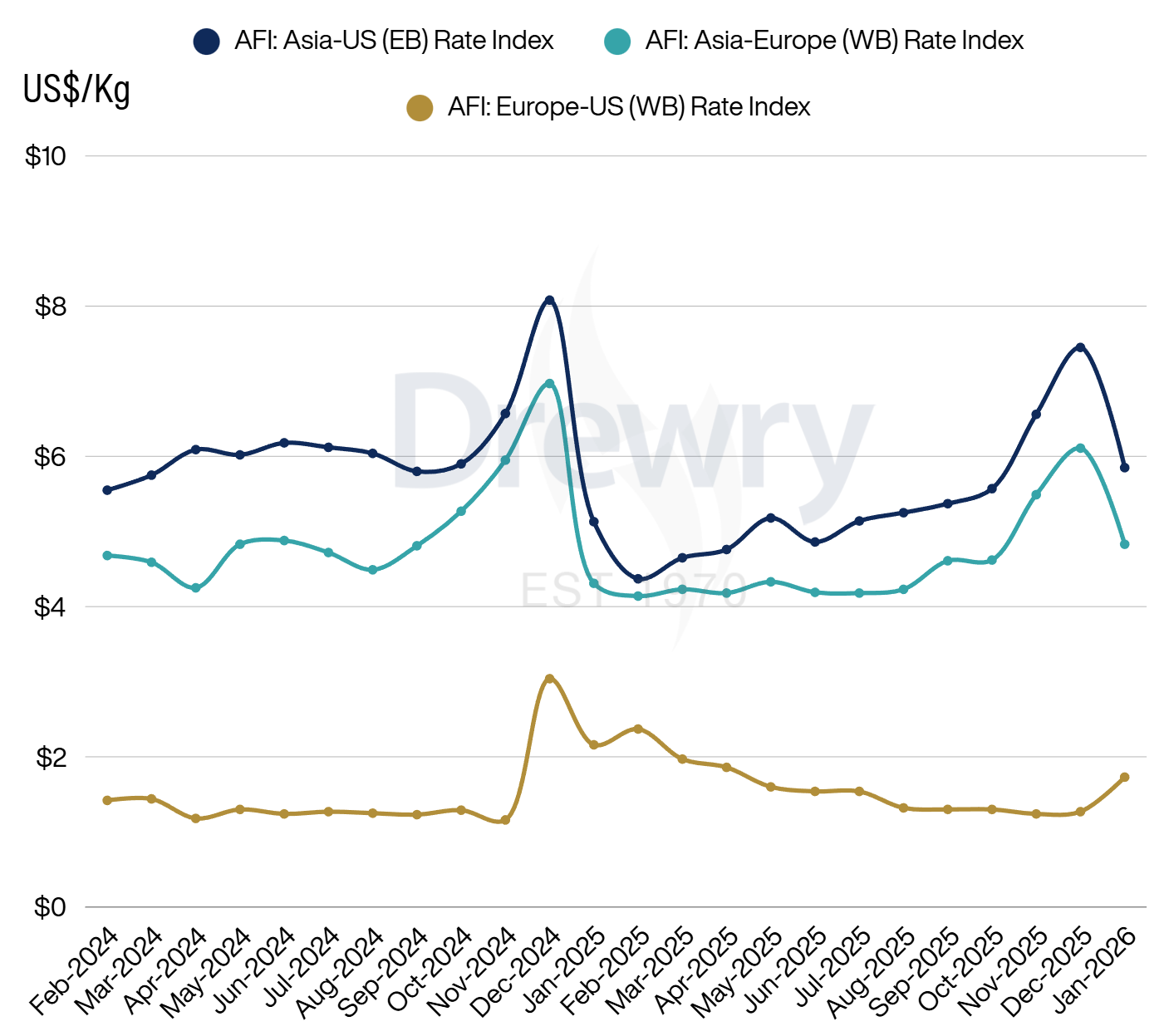 The Drewry Airfreight Price Index for the month is up 4% from February, 10% higher than a year ago. The war triggered a surge in airfreight rates from the afflicted region, with pricing from Dubai to Europe jumping 56-65% from February, while rates from Abu Dhabi to Europe climbed more than 42%. Airfreight rates from South and Southeast Asia also show an immediate impact, as an estimated 30% of Asia-Europe air cargo is routed via Middle Eastern hubs. Rates from India to Europe rose 22-34%. Further pricing pressure could come from mode shifts of strategic commodities like fertilizer stranded by the closure of the Strait of Hormuz.