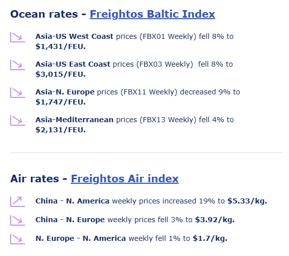 China - Europe prices fell 3% to $3.92/kg, but remain 5% higher than a month ago and about level with last October. The labor disruptions in Belgium impacting ocean freight are also causing air delays, especially to passenger flights, though so far cargo rates remain unaffected.